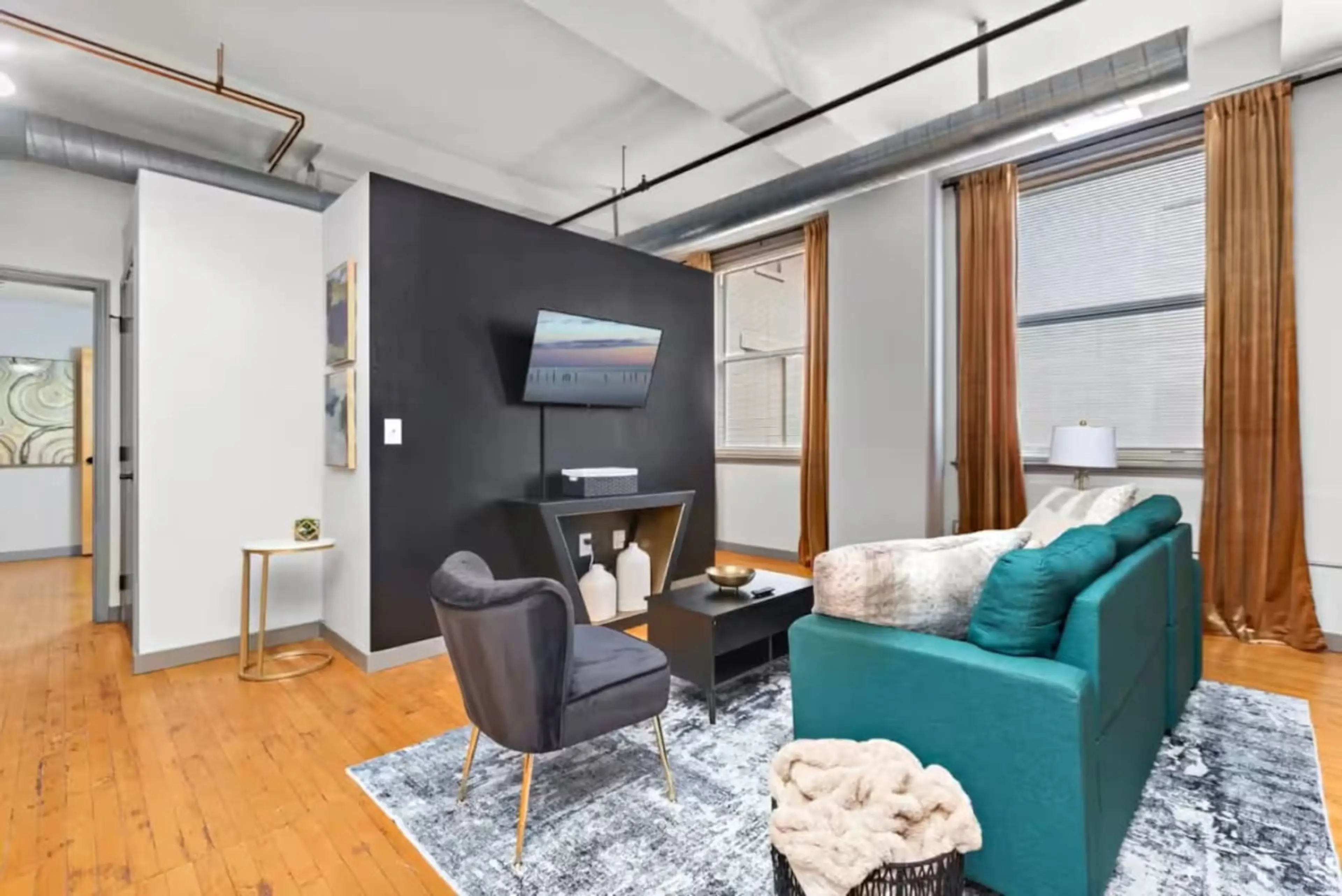 ✨This stylish apartment is the perfect place to call home on your next Kansas City vacation! It features soaring ceilings, stunning bedroom, full kitchen, & access to a pool, hot tub, gym, free Wi-Fi, & parking. Enjoy the central location, just a short walk f rom amazing restaurants, the Power and L...
